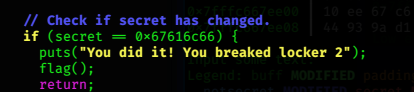 Now, on further examining the source code, I figured that, we need to overwrite the value of secret to another address in order to get the flag,